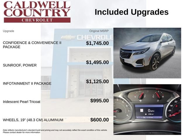 Experience the epitome of style, comfort, and advanced technology with the 2023 Chevrolet Equinox Premier. This exceptional SUV is designed to elevate your driving experience, offering a seamless blend of sophisticated features and impressive performance.Indulge in the premium amenities that set this Equinox apart, including a - Confidence & Convenience II Package, Infotainment II Package, Preferred Equipment Group 1LZ, and more. Enjoy the convenience of a power sunroof, the clarity of a Bose premium audio system, and the connectivity of wireless Apple CarPlay and Android Auto.Discover the perfect balance of form and function with this Equinox Premier. Its sleek, modern exterior is complemented by a spacious and well-appointed interior, providing ample room for your family and cargo. Pamper yourself with heated and ventilated front seats, a heated steering wheel, and a power liftgate for effortless loading and unloading.This Equinox Premier has been meticulously maintained and is backed by our rigorous certification process. With low mileage and a comprehensive inspection, you can trust that this vehicle is in exceptional condition, ready to provide you with years of reliable and enjoyable driving.Elevate your driving experience with the 2023 Chevrolet Equinox Premier. Its potent 1.5L DOHC engine, paired with a 6-speed automatic transmission, delivers an impressive balance of power and efficiency, with an EPA-estimated 26 city/31 highway mpg. Whether you're navigating the city streets or embarking on a road trip, this Equinox Premier will keep you confident and in control.Safety is paramount, and the Equinox Premier is equipped with a suite of advanced driver assistance technologies, including Adaptive Cruise Control, Automatic Front and Rear Parking Assist, and HD Surround Vision. These features work seamlessly to enhance your driving experience and provide added peace of mind.Elevate your driving experience with the 2023 Chevrolet Equinox Premier. Visit our showroom today and let us demonstrate how this exceptional SUV can transform your daily commute and weekend adventures. Experience the perfect blend of style, technology, and performance that will exceed your expectations.