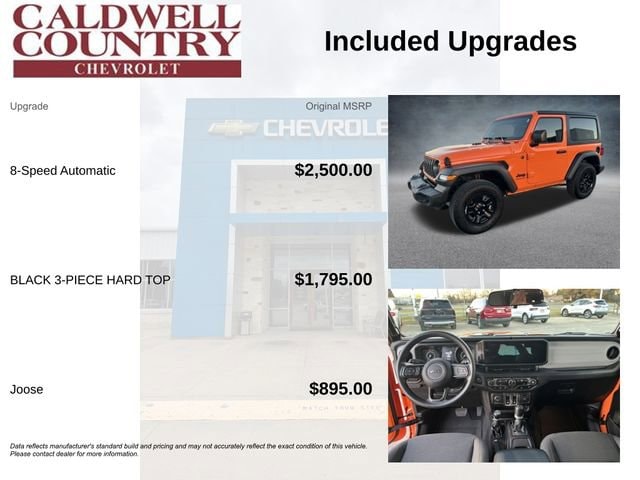 Elevate your off-road adventures with the captivating 2025 Jeep Wrangler Sport. This rugged and versatile SUV is a true testament to Jeep's legendary engineering, offering unparalleled capability and a commanding presence on any terrain.Tailored to your active lifestyle, this Wrangler Sport boasts an array of impressive features, including: 8-Speed Automatic Transmission with Adaptive Cruise Control and Selec-Speed Control Striking Orange Exterior Color Black 3-Piece Hard Top Freedom Panel Storage Bag Rear Window Defroster and Wiper/WasherBeneath the hood, the 2.0L I4 DOHC engine delivers a thrilling driving experience, effortlessly navigating both city streets and off-road challenges with its 4-wheel-drive system. With an impressive fuel efficiency of 20 MPG in the city and 23 MPG on the highway, this Wrangler Sport strikes the perfect balance between power and efficiency.This meticulously maintained Jeep Wrangler Sport has only 2,459 miles on the odometer, ensuring you'll enjoy the exceptional performance and reliability that Jeep is renowned for. As a certified pre-owned vehicle, it has undergone a rigorous inspection and comes with a comprehensive warranty, providing you with the peace of mind you deserve.Imagine the endless possibilities that await you in this exceptional Wrangler Sport. Whether you're tackling rugged trails, navigating city streets, or simply seeking a stylish and capable companion for your adventures, this Jeep is ready to take you there.Experience the thrill of owning a true icon of the off-road world. Visit our showroom today and let us demonstrate how this 2025 Jeep Wrangler Sport can elevate your driving experience to new heights.